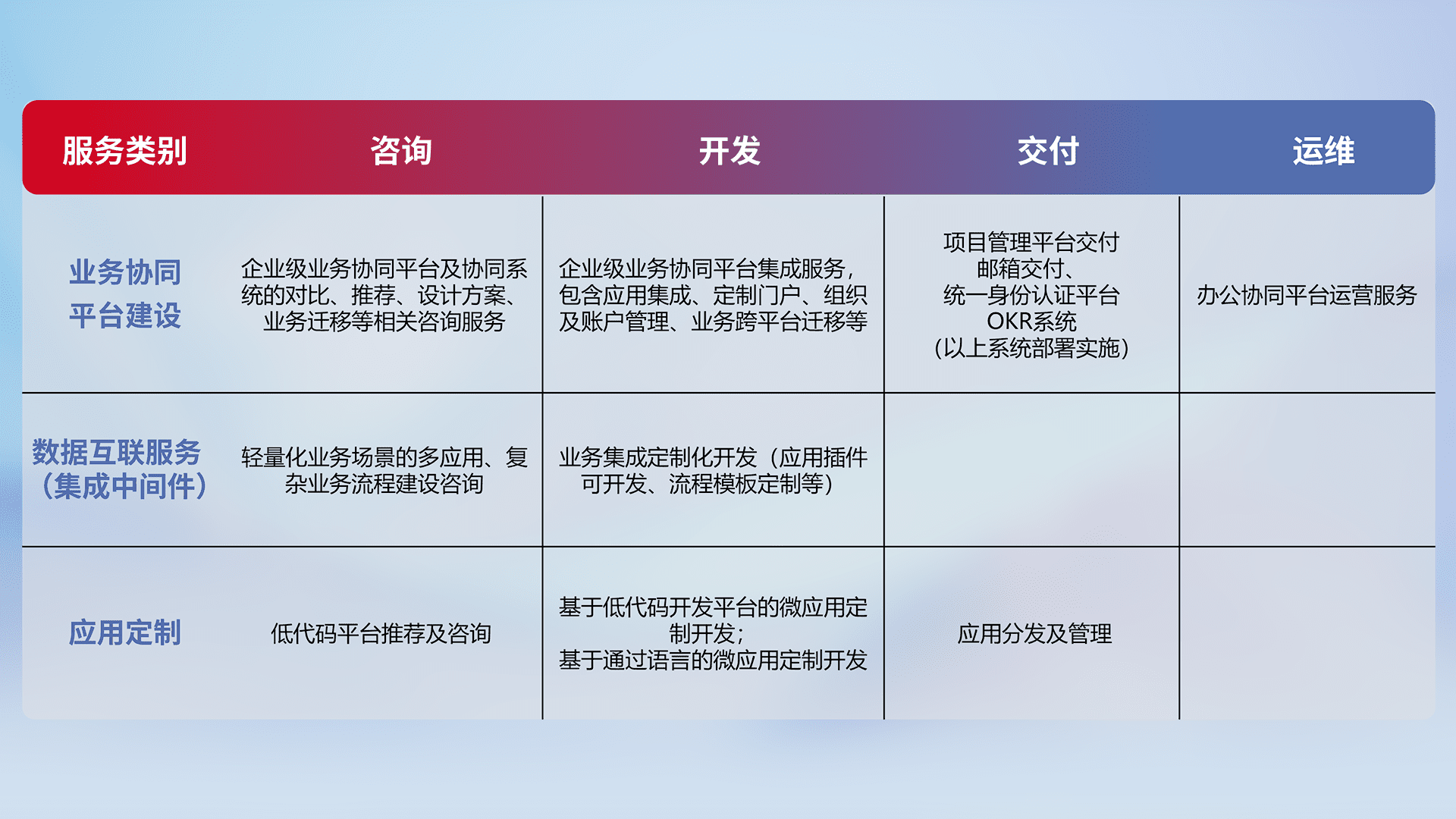 针对钉钉、、企微、、IDaas等平台级产品提供产品的规划、、方案、、交付、、定制化开发等服务,,,实现如统一协同办公、、、、智能客户服务、、、、混合会议管理、、、、智能数据查询、、等业务场景,,,,实现数字化转型。。