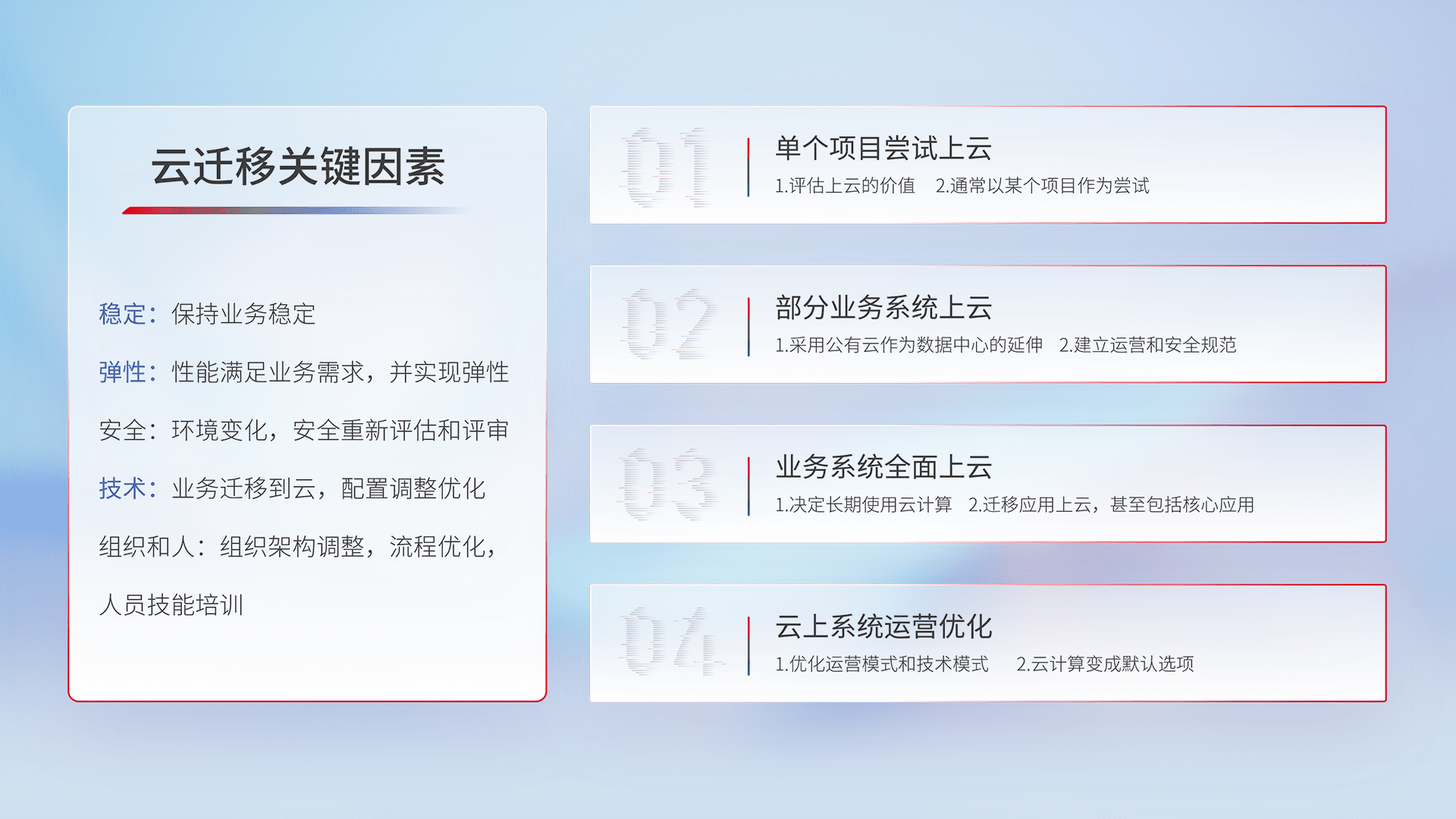 结合实际业务,,从规划设计、、、云平台选型、、云原生改造、、数据迁移、、、、集成交付,,,,迁移全过程为客户识别最佳上云路径,,做好风险识别管理,,,设计网络架构、、、身份权限、、安全审计合规、、、操作审计、、、、日志审计、、监控告警策略、、、多站点容灾设计等,,,对云上基础设施进行整体规划,,,,提升IT治理水平,,以满足弹性、、、高可用、、、高性能的需求。。。
