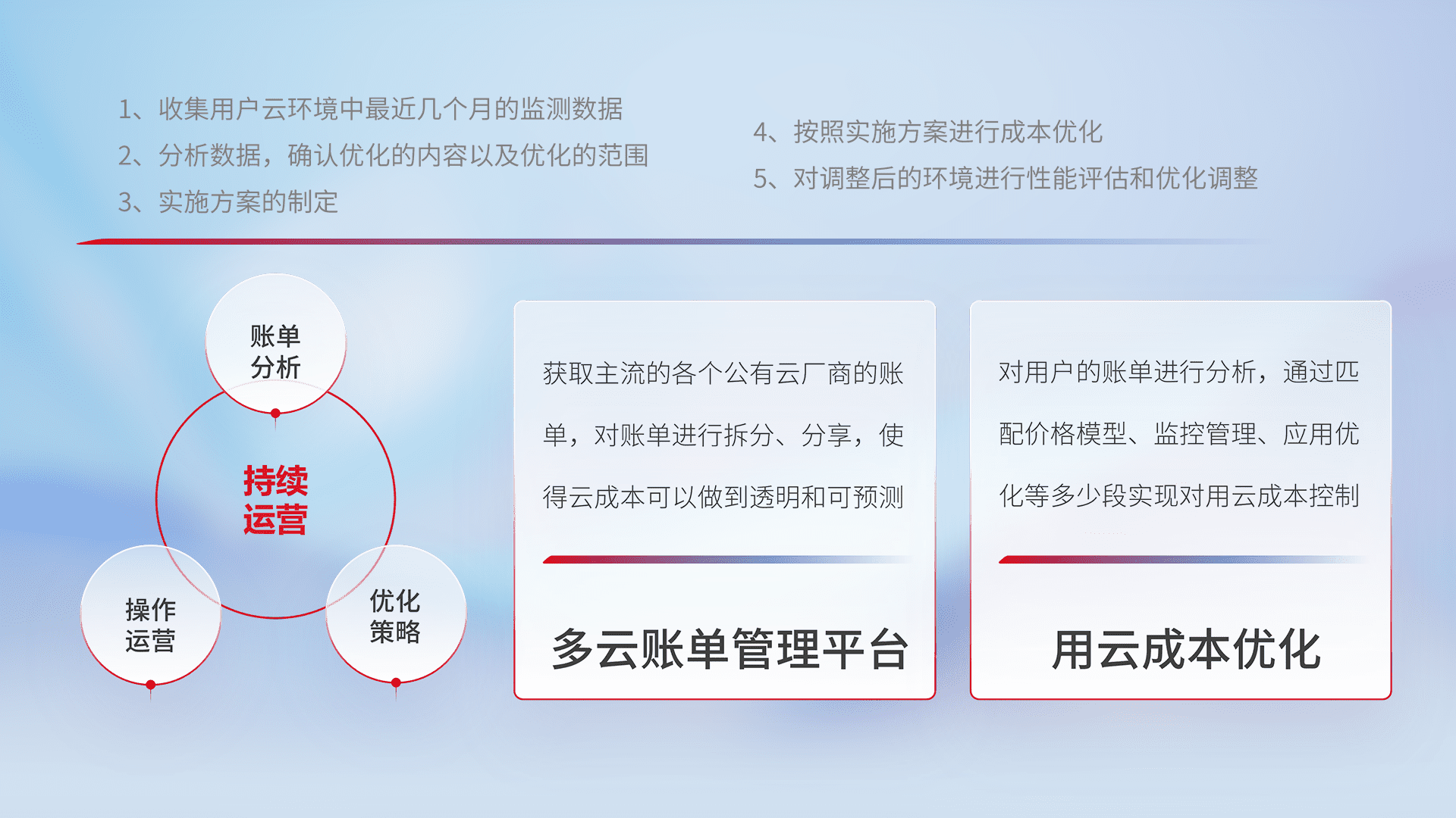 通过灵活运用多种自动化迁移工具,,,帮助企业用户实现业务和数据高效 、、、、稳定的上云迁移和云上迁移,,,采用自研多云纳管平台,,,以中立管理模式,,解决多组织、、、多云、、、、多运维厂商的复杂关系的管理,,保证多云平台资源配置的一致性,,,,实时掌控云资源运行数据,,,,运用智能化工具分析云资源多云平台的管理服务,,透明化管理成本支出,,,用云成本可预测、、、用云费用可优化、、、云资源配额有据可依。。